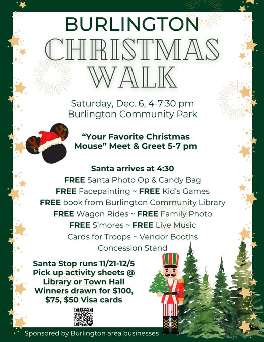 Festivities will open with the arrival of Santa at 4:30 p.m., followed by a special meet-and-greet with “your favorite Christmas Mouse” from 5:7 p.m. Families can look forward to a variety of free activities throughout the evening, including a Santa photo op with a candy bag, face painting, kids’ games, wagon rides, live music, and even a cozy spot to make s’mores. The Burlington Community Library will also be giving away free books to young readers.