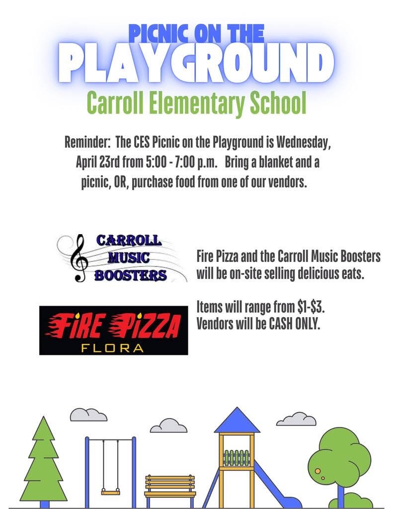 Carroll Consolidated School Corporation announced that Carroll Elementary School will host its Picnic on the Playground tomorrow, Wednesday, April 23 from 5 p.m. to 7 p.m. for community members to come together with their children and experience local vendors.