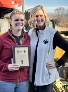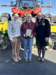 During the Ag Education Day program, Clinton Prairie High School Principal Kirsten Clark joined Indiana State Department of Agriculture Assistant Director of Youth Development Cassie Perrin and District V FFA President Katie McClain to announce Russ’s selection. They presented her with the Golden Owl plaque and the $500 program award, recognizing her work with Clinton Prairie students in agricultural education and FFA leadership.