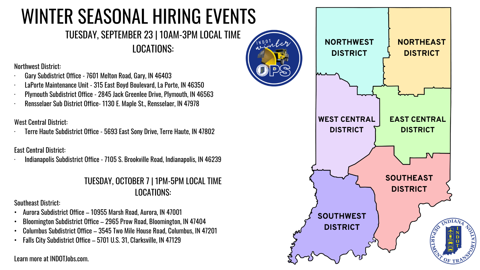 The Indiana Department of Transportation is in search of dedicated, qualified individuals who want to help serve their fellow Hoosiers this winter. INDOT will host winter seasonal hiring events on Tuesday, September 23, from 10 a.m. until 3 p.m. local time, at six locations across the state, and on Tuesday, October 7, from 1 p.m. until 5 p.m. local time at four locations in the Southeast district.
