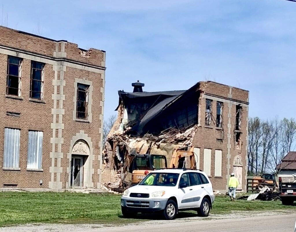 Dust clouds and splintered bricks filled the air this week as excavators began dismantling the structure that once echoed with the footsteps of students from Jefferson Township and neighboring Perry Township in Colfax. The demolition fulfills plans first announced by Dion Ventura, president of Versatile Construction, nearly a year ago in May 2025.