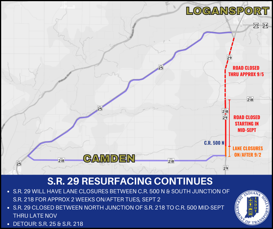 Starting in mid-September, State Road 29 will be closed between the north junction of State Road 218 and C.R. 500 N. This resurfacing will be a full depth reclamation where the entire asphalt pavement and a portion of the underlying materials are pulverized and blended to create a stabilized base course for a new surface layer. The road will be fully closed to all traffic in the area where work is occurring.
