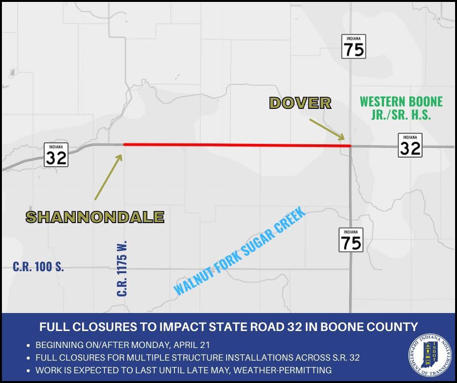 Beginning on or after Monday, April 21, crews will begin several closures on S.R. 32 from County Road 1175 W. to S.R. 75 for continued roadway improvements near Western Boone High School. This upcoming phase of the project involves several pipe installations, with work beginning on the west end of the project to allow better access for school busses.
