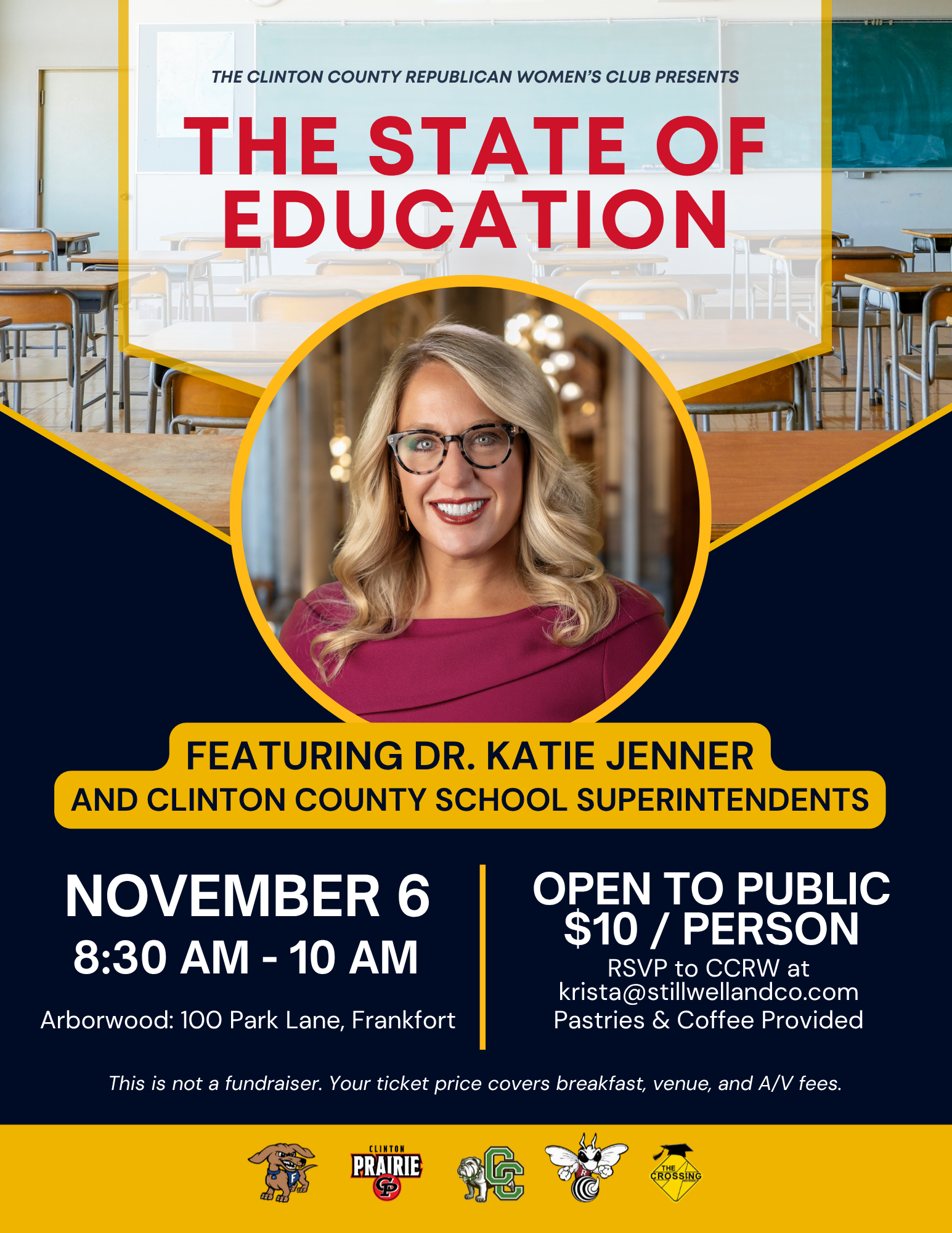 Dr. Jenner will deliver an address on the current and future direction of education in Indiana, offering insight into policy priorities and initiatives shaping both K–12 and higher education. Following her remarks, she will join Clinton County’s five public school superintendents for a panel discussion that will highlight local perspectives and the challenges and opportunities facing schools across the county.