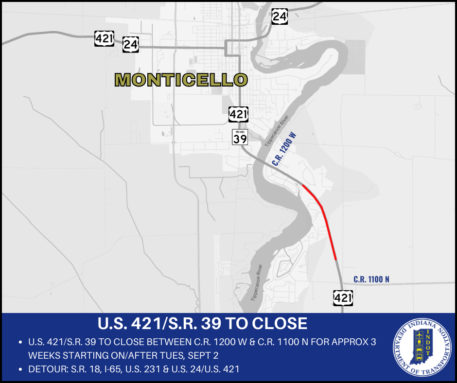 U.S. 421/State Road 39 will be closed for approximately three weeks for small structure maintenance and repair. Motorists should seek alternate routes. The official detour will follow State Road 18, I-65, U.S. 231 and U.S. 24/U.S. 421.